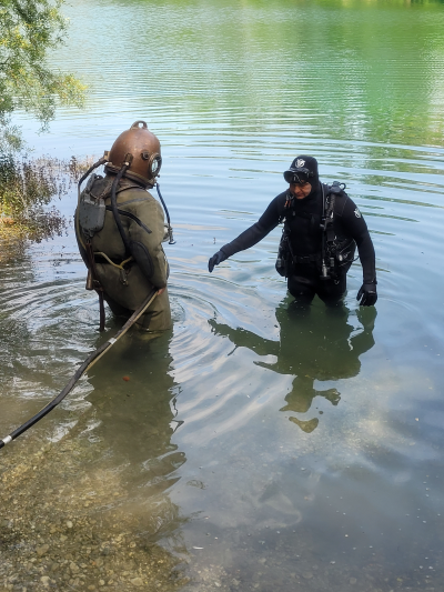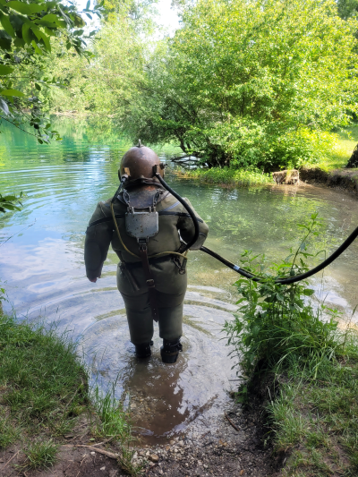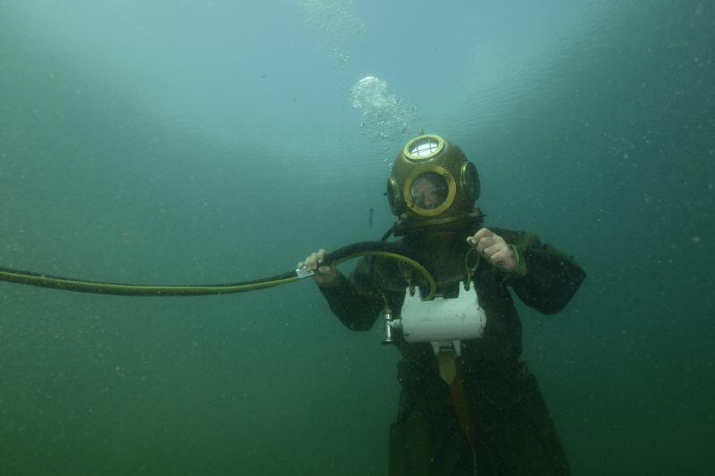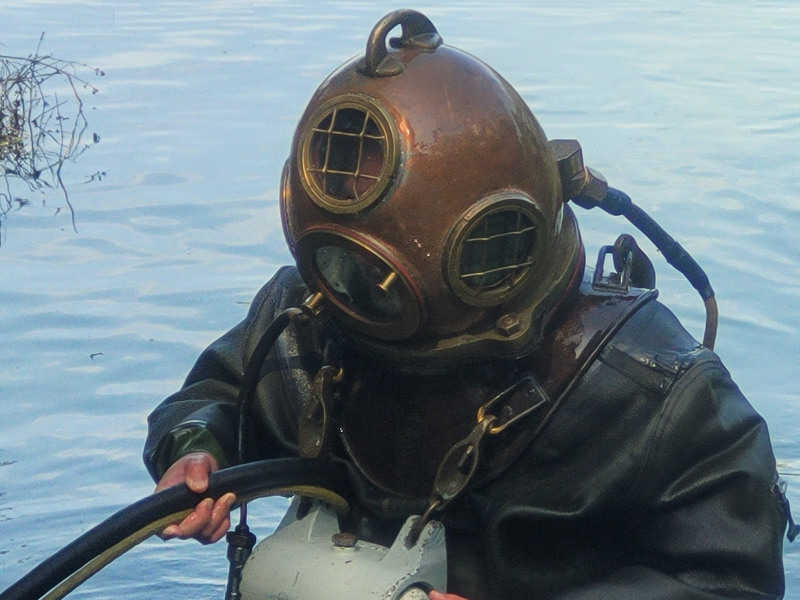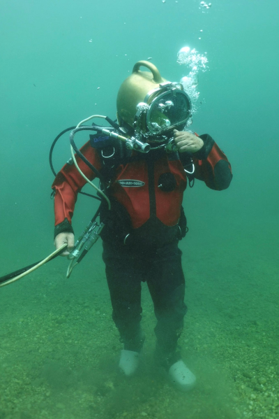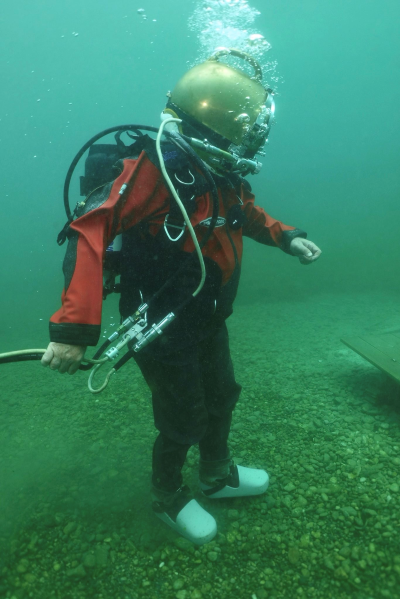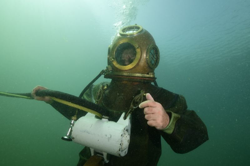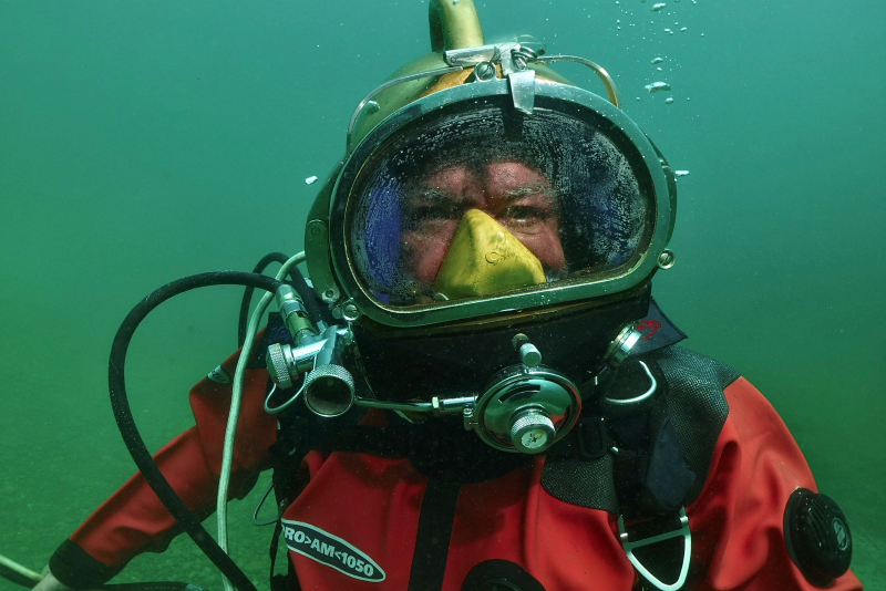 Das Hintergrundbild zeigt einen Taucher in einer Dräger DM40 Mischgas-Helmtauchausrüstung