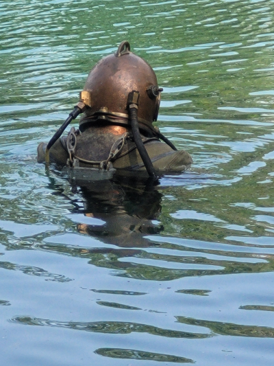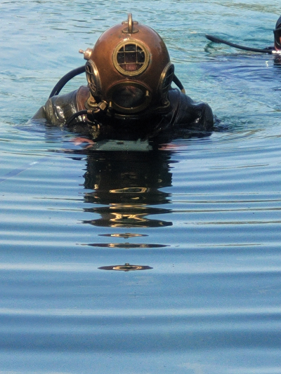 | So, nach dem COMEX-Tauchgang konnte jeder, der wollte, noch einen Tauchgang mit dem schlauchversorgten MEDI-Helm machen. Ich war den Helm zwar schon einige Male getaucht, es macht aber immer Spaß, auch mal wieder mit einem echten Kupferhelm zu tauchen. Die alten Kupferhelme, u.A. auch das DM40 von Dräger, das ja ein offenes Kreislaufsystem darstellt, arbeiten natürlich im Gegensatz zum COMEX-Helm nach dem Free-Flow Prinzip. | |